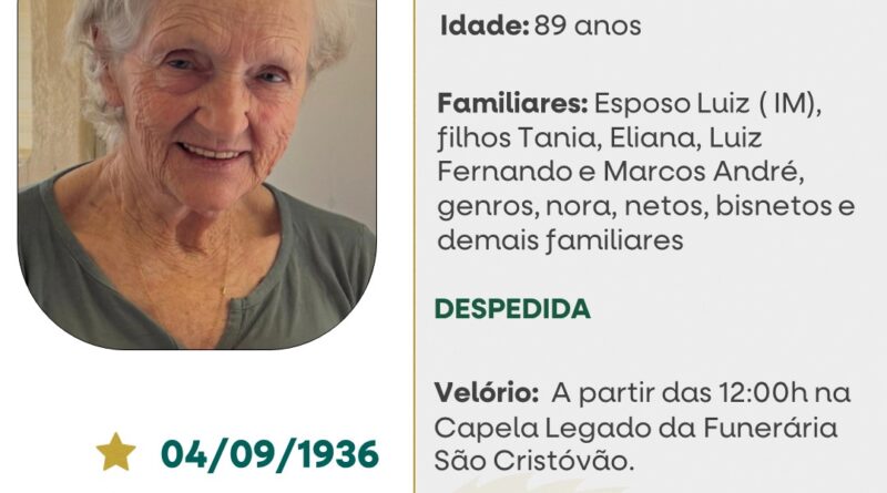 A Funerária São Cristóvão, juntamente com a família Fortunato, comunica com pesar, o falecimento de Elsa Fortunato, ocorrido dia 08/03/2026 em sua residência em Tapejara com 89 anos de idade. Seu corpo está sendo velado na Capela Legado da Funerária São Cristóvão. Celebração às 17 horas do dia 08/03/2026 e após seu sepultamento no Cemitério Municipal João Rombaldi de Tapejara.