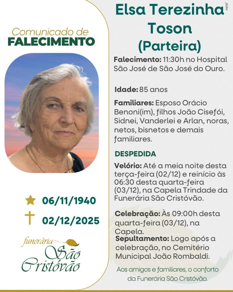 A Funerária São Cristóvão, juntamente com a família Toson, comunica com pesar, o falecimento de Elsa Terezinha Toson, ocorrido às 11h30 do dia 02/12/2025 no Hospital São José de São José do Ouro com 85 anos de idade. Seu corpo está sendo velado na Capela Trindade da Funerária São Cristóvão. Celebração às 09 horas do dia 03/12/2025 e após seu sepultamento no Cemitério Municipal João Rombaldi de Tapejara.
