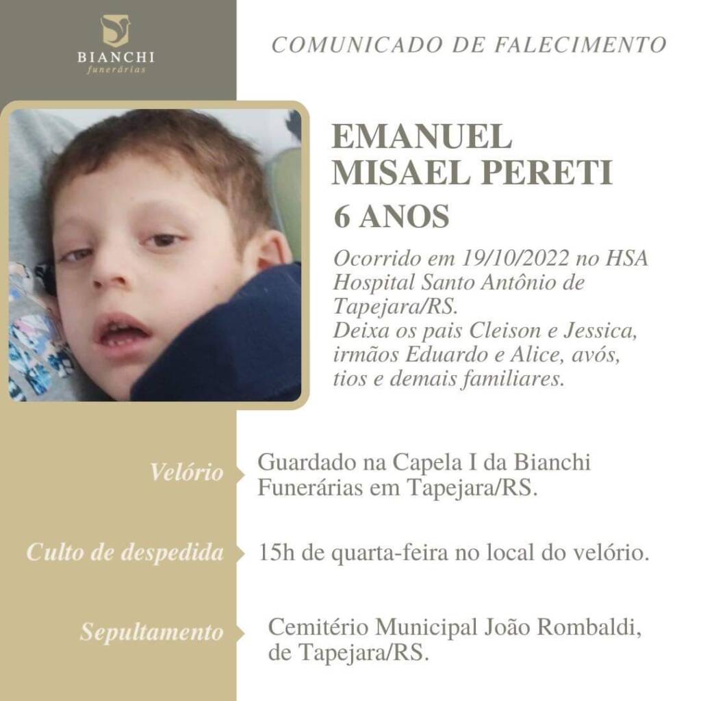 A Bianchi Funerárias, juntamente com a família Pereti comunica com pesar, o falecimento de Emanuel Misael Pereti, ocorrido dia 19/10 no HSA com 6 anos de idade. Seu corpo está sendo guardado na Capela da Bianchi Funerárias. Culto de despedida às 15:00 horas e após seu sepultamento no Cemitério Municipal João Rombaldi.
