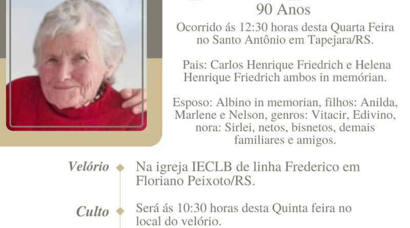 A Bianchi Funerárias, juntamente com a família Zuss, comunica com pesar, o falecimento de Emília Friedrich Zuss, ocorrido às 12h30 do dia 09/10/2024 no HSA de Tapejara com 90 anos de idade. Seu corpo está sendo velado na Igreja IECLB de Linha Frederico em Floriano Peixoto – RS. Culto às 10h30 do dia 10/10/2024 e após seu sepultamento no Cemitério da mesma localidade.
