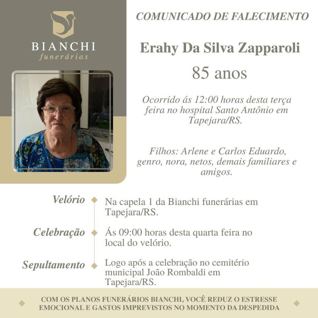 A Bianchi Funerárias, juntamente com a família Zapparoli, comunica com pesar, o falecimento de Erahy Da Silva Zapparoli, 85 anos, ocorrido ao meio-dia desta terça, 24 de janeiro de 2023, no Hospital Santo Antônio (HSA).