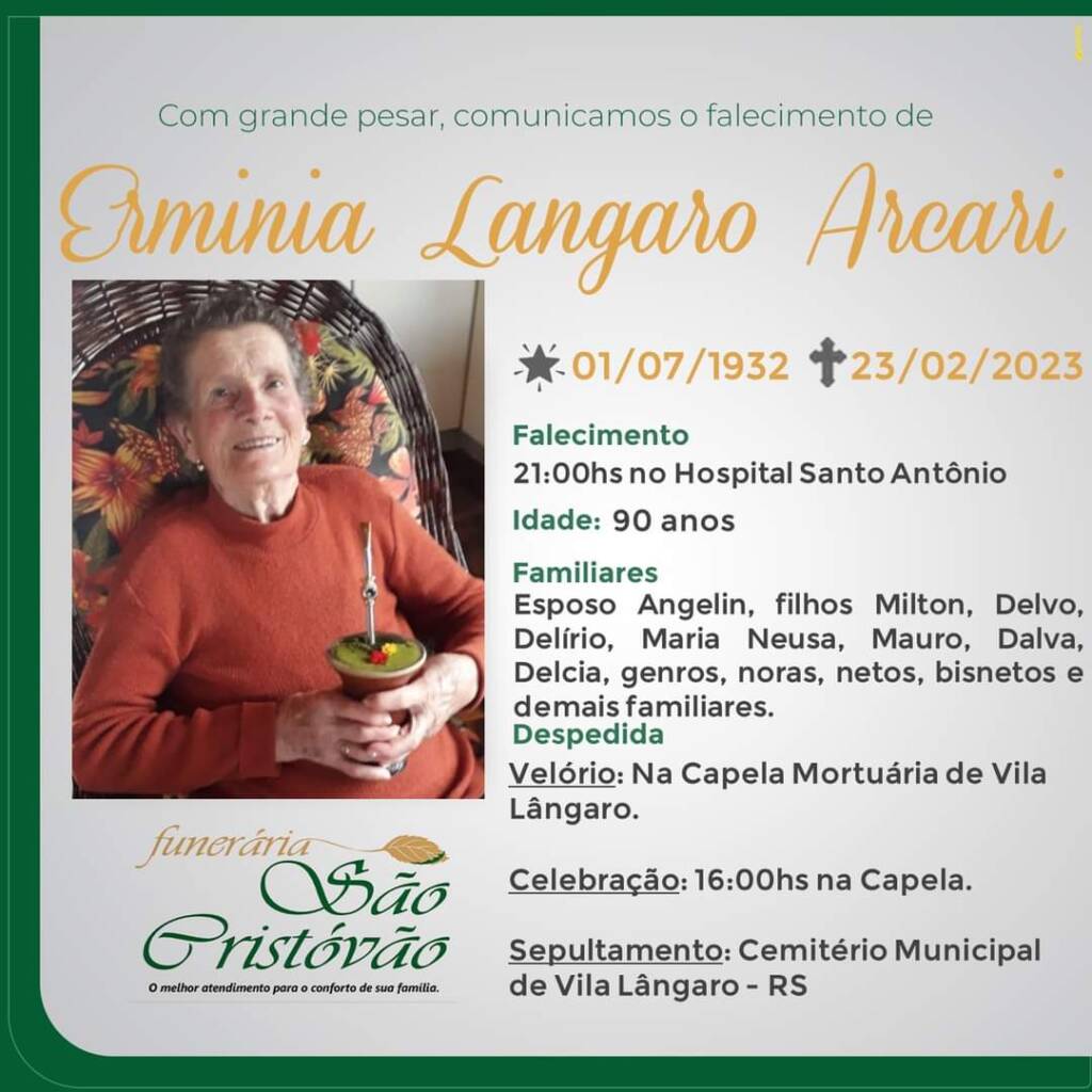 A Funerária São Cristóvão, juntamente com a família Arcari, comunica com pesar, o falecimento de Erminia Lângaro Arcari, ocorrido às 21:00 horas do dia 23/02/2023 no HSA com 90 anos de idade. Seu corpo está sendo velado na Capela Mortuária de Vila Lângro. Celebração às 16:00 horas do dia 24/02/2023 e após seu sepultamento no Cemitério Municipal de Vila Lângaro.