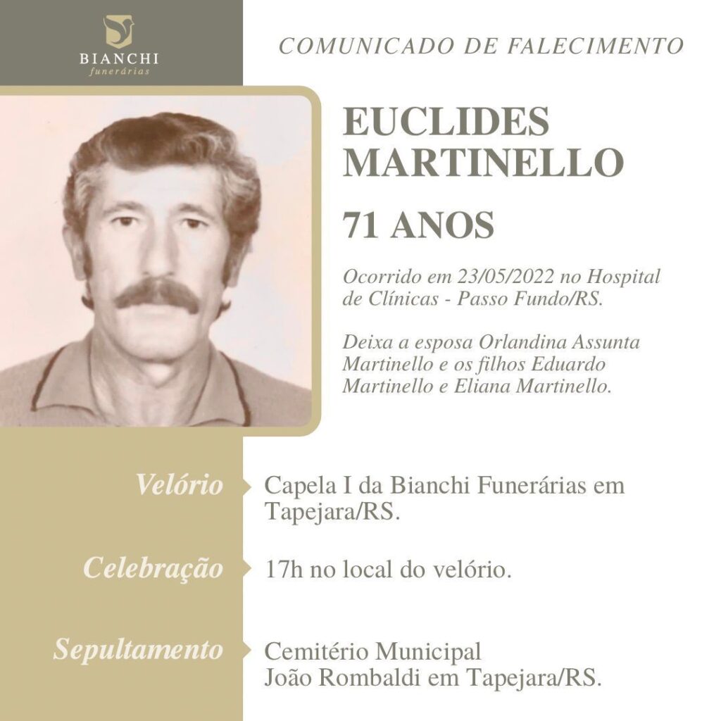 A Bianchi Funerárias, juntamente com a família Martinello, comunica com pesar o falecimento do senhor EUCLIDES MARTINELLO, com 71 anos de idade, ocorrido em 23/05/2022, no Hospital de Clínicas em Passo Fundo/RS.