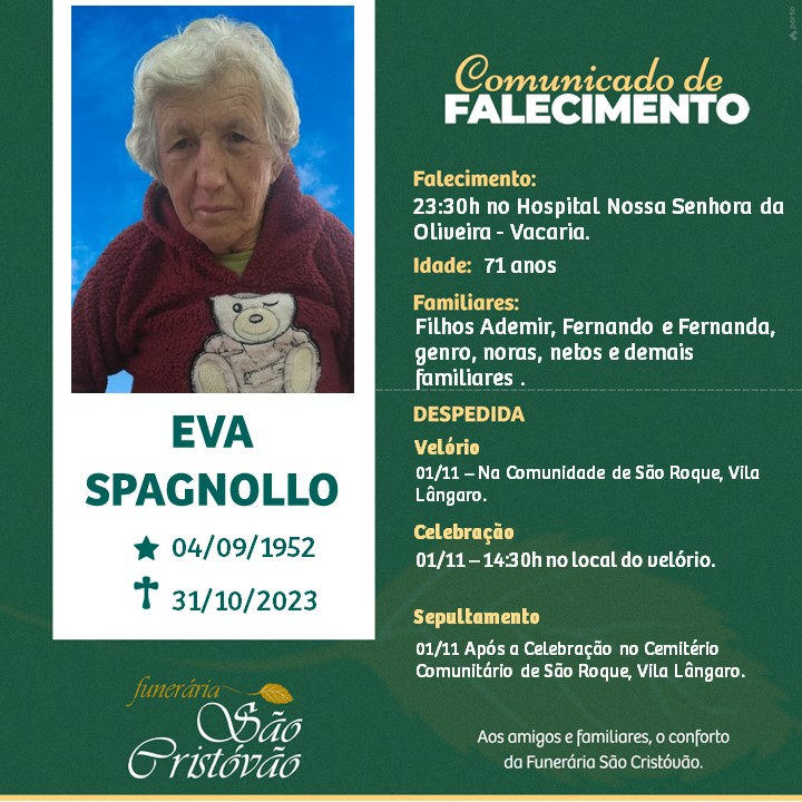 A Funerária São Cristóvão, juntamente com a família Spagnollo, comunica com pesar, o falecimento de Eva Spagnollo, ocorrido às 23h30 do dia 31/10/2023 no Hospital Nossa Senhora da Oliveira – Vacaria. Seu corpo está sendo velado na Comunidade de São Roque – Vila Lângaro. Celebração às 14h30 do dia 01/11/2023 e após seu sepultamento no Cemitério da Comunidade de São Roque – Vila Lângaro.