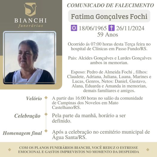 A Bianchi Funerárias, juntamente com a família Fochi, comunica com pesar, o falecimento de Fátima Gonçalves Fochi, ocorrido às 07 horas do dia 26/11/2024 no Hospital de Clínicas de Passo Fundo com 59 anos de idade. Seu corpo está sendo velado no Salão da Comunidade de Campinas dos Novelos – Mato Castelhano. Celebração pela parte da manhã do dia 27/11/2024 com horário a ser definido e após seu sepultamento no Cemitério Municipal de Água Santa.