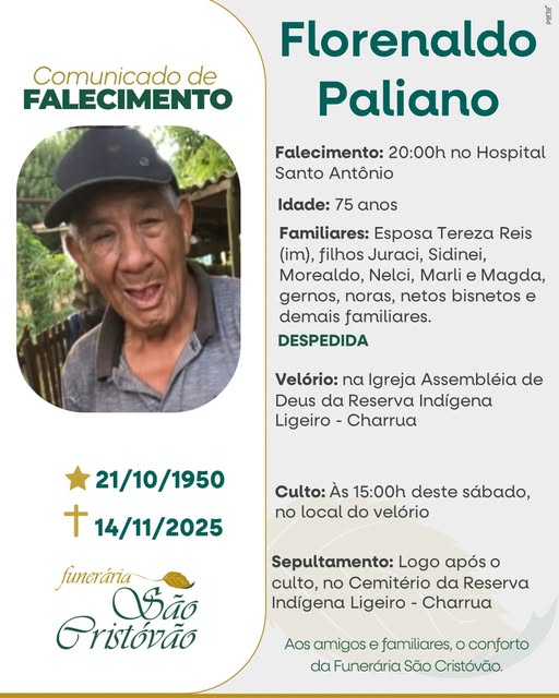 A Funerária São Cristóvão, juntamente com a família Paliano, comunica com pesar, o falecimento de Florenaldo Paliano, ocorrido às 20 horas do dia 14/11/2025 no HSA em Tapejara com 75 anos de idade. Seu corpo está sendo guardado na Igreja Assembleia de Deus da Reserva Indígena Ligeiro de Charrua . Culto às 15 horas do dia 15/11/2025 e após seu sepultamento cemitério da mesma localidade.