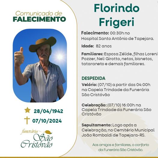 A Funerária São Cristóvão, juntamente com a família Frigeri, comunica com pesar, o falecimento de Florindo Frigeri, ocorrido à 00h30 do dia 07/10/2024 no HSA de Tapejara com 82 anos de idade. Seu corpo está sendo velado na Capela Trindade da Funerária São Cristóvão. Celebração às 16 horas do dia 07/10/2024 e após seu sepultamento no Cemitério Municipal João Rombaldi de Tapejara.