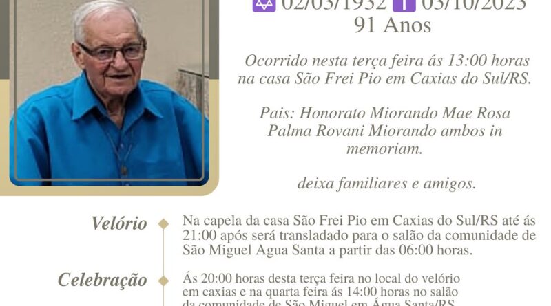A Bianchi Funerárias, juntamente com a família Miorando, comunica com pesar, o falecimento do Frei Germano Miorando, ocorrido às 13 horas do dia 03/10/2023 na Casa Frei Pio em Caxias do Sul – RS com 91anos de idade. Seu corpo está sendo velado Capela da Casa São Frei Pio de Caxias do Sul até às 21 horas do dia 03/10/2023 e após seu corpo será transladado para a Comunidade de São Miguel – Água Santa. Celebração às 14 horas do dia 04/10/2023 e após seu sepultamento no Cemitério da Comunidade de São Miguel – Água Santa.