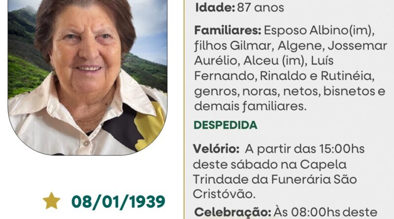 A Funerária São Cristóvão, juntamente coma família Sossella, comunica com pesar, o falecimento de Gema Sossella, ocorrido às 09h45 do dia 24/01/2026 no Hospital de Clínicas de Passo Fundo, com 87 anos de idade. Seu corpo está sendo velado na Capela Trindade da Funerária São Cristóvão. Celebração às 08 horas do dia 25/01/2026 e após seu sepultamento no Cemitério de Vista Alegre – Santa Cecília do Sul.