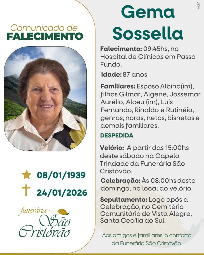 A Funerária São Cristóvão, juntamente coma família Sossella, comunica com pesar, o falecimento de Gema Sossella, ocorrido às 09h45 do dia 24/01/2026 no Hospital de Clínicas de Passo Fundo, com 87 anos de idade. Seu corpo está sendo velado na Capela Trindade da Funerária São Cristóvão. Celebração às 08 horas do dia 25/01/2026 e após seu sepultamento no Cemitério de Vista Alegre – Santa Cecília do Sul.