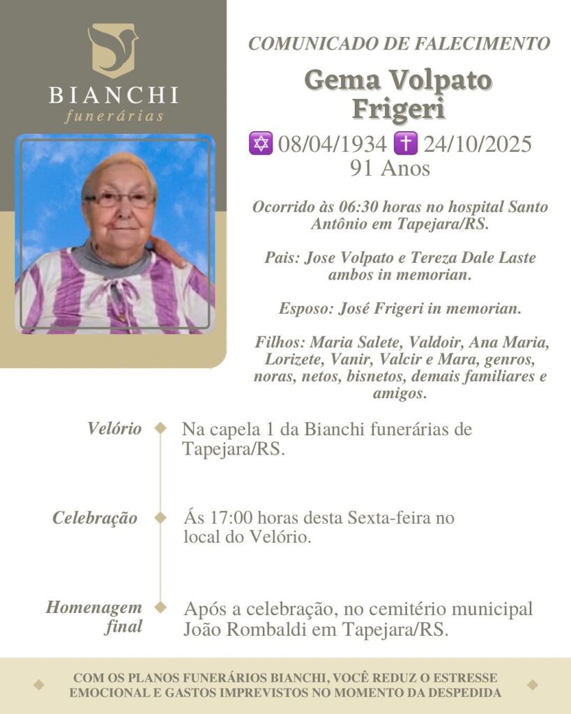 A Bianchi Funerárias, juntamente com a Bianchi Funerárias, comunica com pesar, o falecimento de Gema Volpato Frigeri, ocorrido às 06h30 do dia 24/10/2025 no HSA de Tapejara com 91 anos de idade. Seu corpo está sendo velado na Capela 1 da Bianchi Funerárias. Celebração às 17 horas do dia 24/10/2025 e após seu sepultamento no Cemitério Municipal João Rombaldi