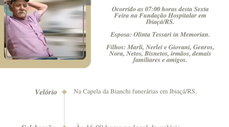 A Bianchi Funerárias, juntamente com a família Machado, comunica com pesar, o falecimento de Getúlio de Souza Machado, ocorrido às 07 horas do dia 27/02/2026 na Fundação Hospitalar de Ibiaçá com 77 anos de idade. Seu. Corpo está sendo velado na Capela da Bianchi Funerárias de Ibiaçá. Celebração às 16 horas e após seu sepultamento no Cemitério da Comunidade de Vila Vitória – Ibiaçá.
