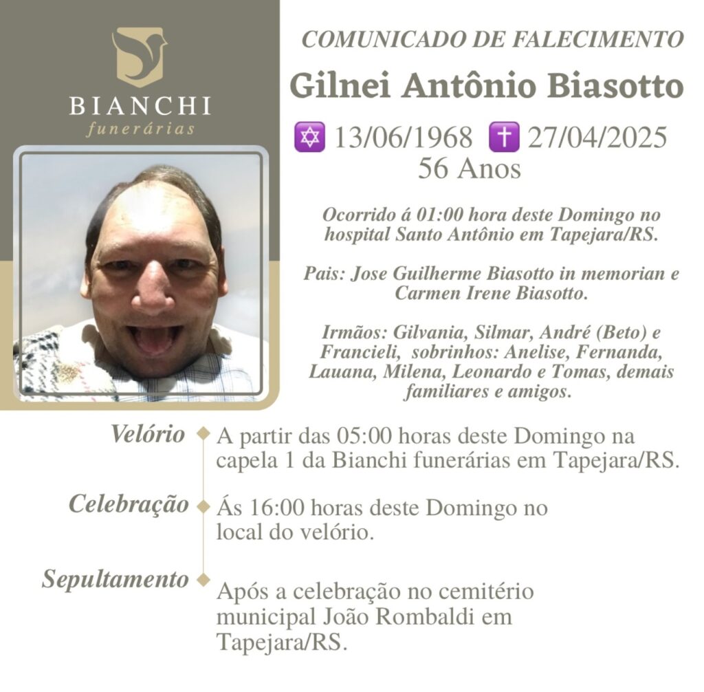 A Bianchi Funerárias, juntamente com a família da Biasotto, comunica com pesar, o falecimento de Gilnei Antônio Biasotto ocorrido à 01 hora do dia 27/04/2025 no HSA de Tapejara com 56 anos de idade. Seu corpo está sendo velado na Capela 1 da Bianchi Funerárias. Celebração às 16 horas do dia 27/04/2025 e após seu sepultamento no Cemitério Municipal João Rombaldi.