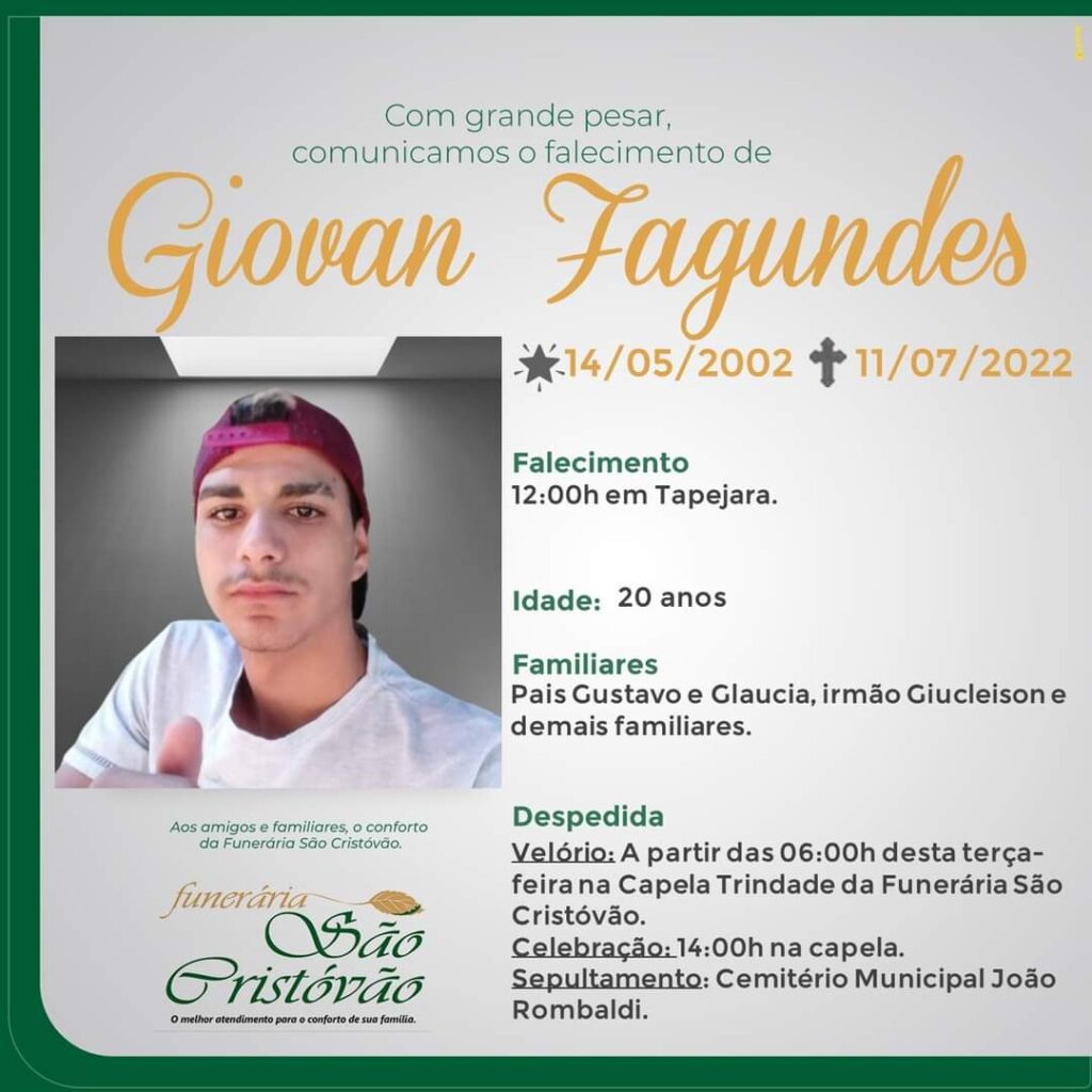 A Funerária São Cristóvão, juntamente com a família Fagundes, comunica com pesar, o falecimento de Giovan Fagundes, ocorrido às 11:30 horas do dia 11/07 em Tapejara, com 20 anos de idade. Seu corpo será velado a partir das 06:00 horas do dia 12/07 na Capela Trindade da Funerária São Cristóvão. Celebração às 14:00 horas e após seu sepultamento. No Cemitério Municipal João Rombaldi.