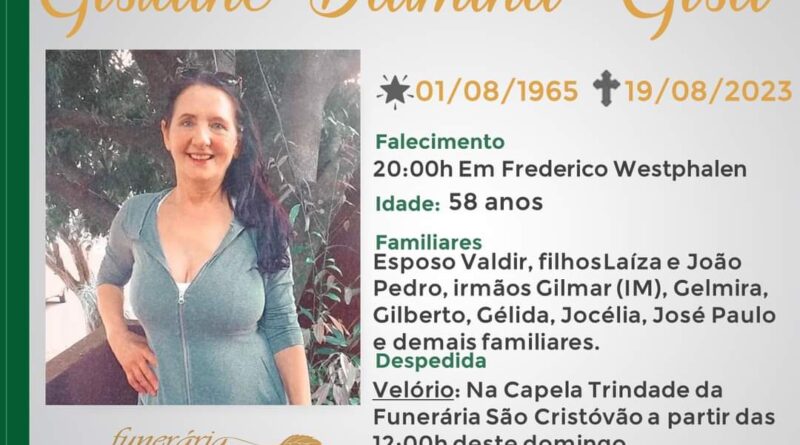 A Funerária São Cristóvão, juntamente com a família Dalmina, comunica com pesar, o falecimento de Gislaine Dalmina – “Gisa”, ocorrido às 20 horas do dia 19/08/2023 em Frederico Westphalen com 58 anos de idade. Seu corpo será velado a partir das 12 horas do dia 20/08/2023 na Capela Trindade da Funerária São Cristóvão. Celebração às 17 horas do dia e após seu sepultamento no Cemitério Municipal João Rombaldi.