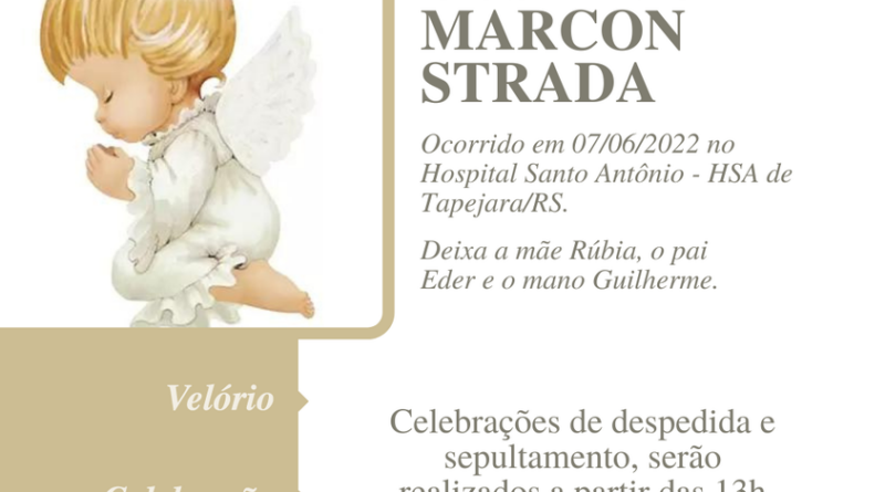 A Bianchi Funerárias, juntamente com as famílias Marcon Strada, comunica com pesar, o falecimento de GUSTAVO MARCON STRADA, ocorrido em 07/06/2022, no Hospital Santo Antônio – HSA, em Tapejara/RS. Celebrações de despedida e enterro a partir das 13:00 horas no Cemitério Municipal João Rombaldi.