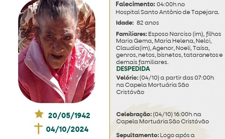 A Funerária São Cristóvão, juntamente com a família Ferreira, comunica com pesar, o falecimento de Idalina Ferreira, ocorrido às 04 horas do dia 04/10/2024 no HSA de Tapejara com 82 anos de idade. Seu corpo está sendo velado na Capela Mortuária São Cristóvão. Celebração às 16 horas do dia 04/10/2024 e após seu sepultamento no Cemitério Municopal João Rombaldi.