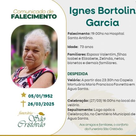 A Funerária São Cristóvão, juntamente com a família Garcia, comunica com pesar, o falecimento de Ignes Bortolin Garcia, ocorrido às 19 horas do dia 26/03/2025 no HSA de Tapejara com 73 anos de idade. Seu corpo está sendo velado na Capela Mortuária de Água Santa. Celebração às 16 horas do dia 27/03/2025 e após seu sepultamento no Cemitério Municipal de Água Santa.
