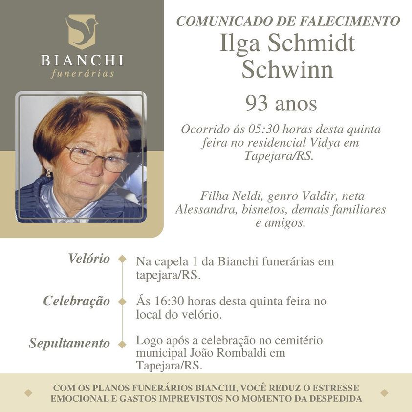 A Bianchi Funerárias, juntamente com a família Schwinn, comunica com pesar, o falecimento de Ilga Schimidt Schwinn, ocorrido às 05:30 horas do dia 02/02/2023 no Residencial Vidya com 93 anos de idade. Seu corpo está sendo velado na Capela I da Bianchi Funerárias. Celebração às 16:30 horas do dia 02/02/2023 e após seu sepultamento no Cemitério Municipal João Rombaldi.