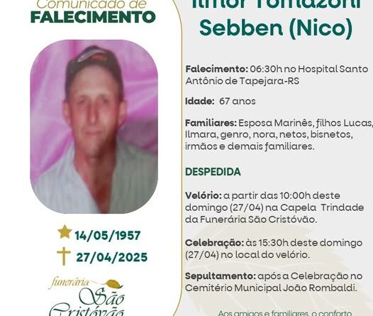 A Funerária São Cristóvão, juntamente com a família Sebben, comunica com pesar, o falecimento de Ilmor Tomazoni Sebben – “Nico”, ocorrido às 06h30 do dia 27/04/2025 no HSA de Tapejara com 67 anos de idade. Seu corpo está sendo velado na Capela Trindade da Funerária São Cristóvão. Celebração às 15h30 do dia 27/04/2025 e após seu sepultamento no Cemitério Municipal João Rombaldi.