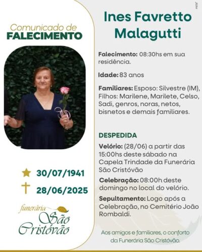 A Funerária São Cristóvão, juntamente com a família Malagutti, comunica com pesar, o falecimento de Ines Favretto Malagutti, ocorrido às 08h30 do dia 28/06/2025 em sua residência com 83 anos de idade. Seu corpo será velado a partir das 15 horas na Capela Trindade da Funerária São Cristóvão. Celebração às 08 horas do dia 29/06/2025 no local do velório e após seu sepultamento no Cemitério Municipal João Rombaldi.