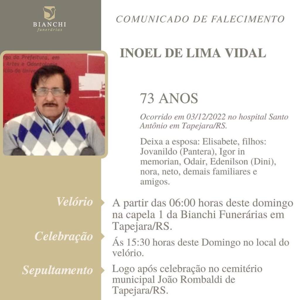 A Bianchi Funerárias, juntamente com a família Vidal, comunica com pesar, o falecimento de Inoel de Lima Vidal, ocorrido dia 03/12 no HSA com 73 anos de idade. Seu corpo será sendo velado a partir das 06:00 horas de domingo, 04/12 na Capela I da Bianchi Funerárias. Celebração às 15:30 horas e após seu sepultamento no Cemitério Municipal João Rombaldi.
