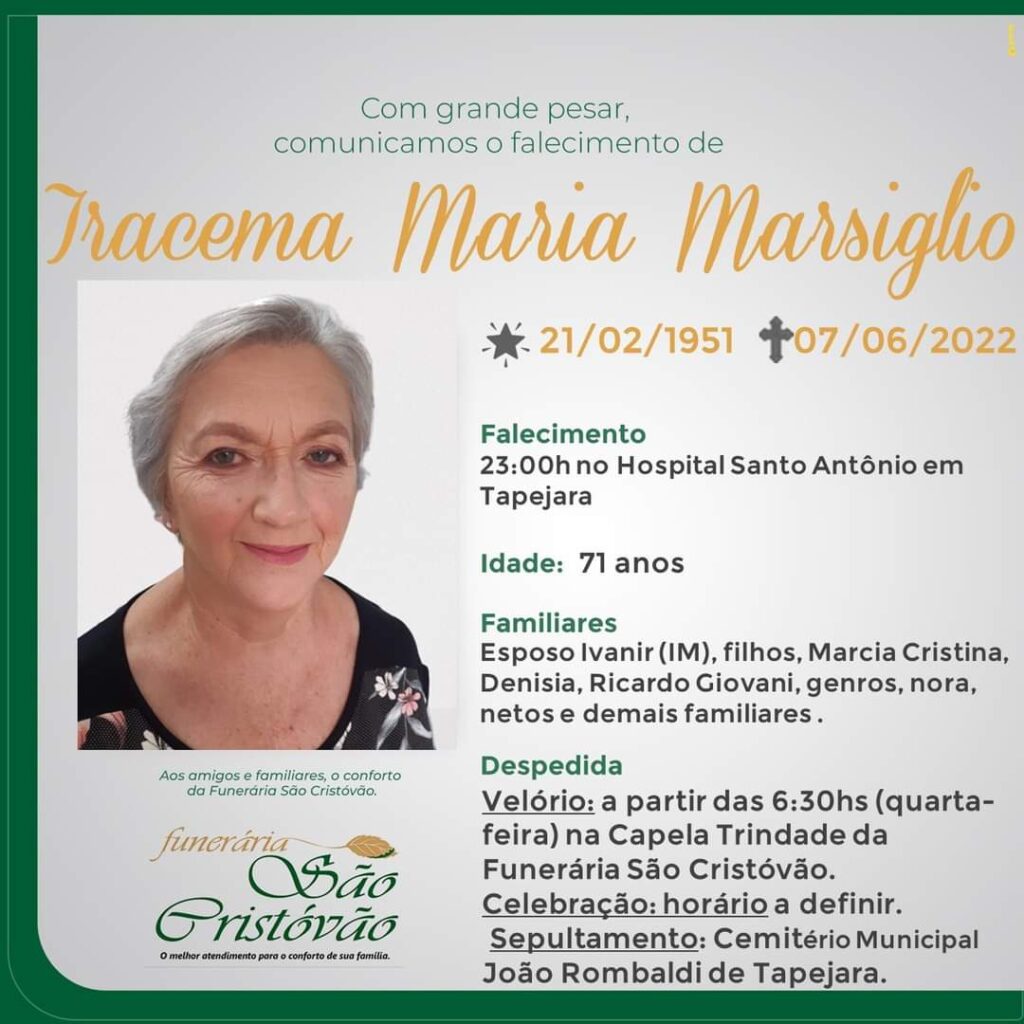 A Funerária São Cristóvão, juntamente com a família Marsíglio, comunica com pesar, o falecimento de Iracema Maria Marsiglio, ocorrido às 23:00 horas de terça-feira (07/06) no HSA com 71 anos de idade. Seu corpo está sendo velado na Capela Trindade da Funerária São Cristóvão. Celebração e sepultamento com horario a ser definido.