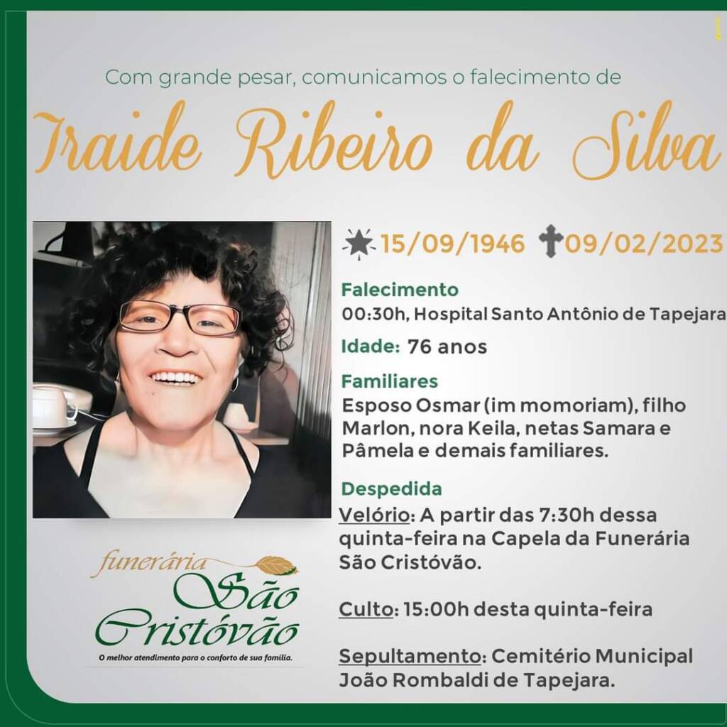 A Funerária São Cristóvão, juntamente com a família da Silva comunica com pesar, o falecimento de Iraíde Ribeiro da Silva, ocorrido às 00:30 horas do dia 08/02/2023 no HSA com 76 anos de idade. Seu corpo será velado a partir das 07:30 horas do dia 09/02/2023 na Capela da Funerária São Cristóvão. Celebração às 15:00 hora e após seu sepultamento no Cemitério Municipal João Rombaldi.