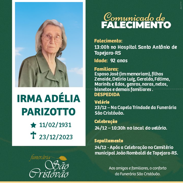 A Funerária São Cristóvão, juntamente com a família Parizotto, comunica com pesar, o falecimento de Irma Adelia Parizotto, ocorrido às 13 horas do dia 23/12/2023 no HSA com 92 anos de idade. Seu corpo está sendo velado na Capela Ttrindade da Funerária São Cristóvão. Celebração às 10h30 do dia 24/12/2023 e após seu sepultamento no Cemitério Municipal João Rombaldi.