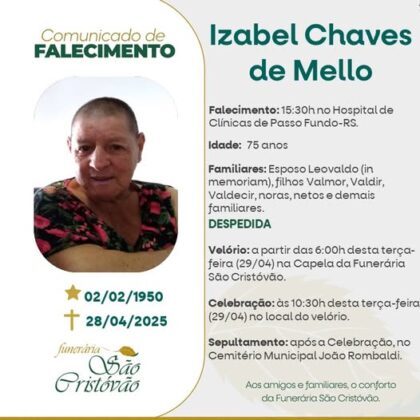 A Funerária São Cristóvão, juntamente com a família de Mello, comunica com pesar, o falecimento de Isabel Chaves de Mello, ocorrido às 15h30 do dia 28/04/2025 no Hospital de Clínicas de Passo Fundo com 75 anos de idade. Seu corpo será velado a partir das 06 horas do dia 29/04/2025 na Capela da Funerária São Cristóvão. Celebração às 10h30 do dia 29/04/2025 e após seu sepultamento no Cemitério Municipal João Rombaldi.