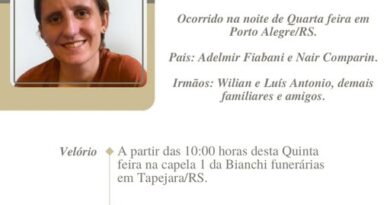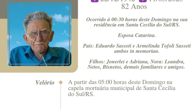 A Bianchi Funerárias, juntamente com a família Sasseti, comunica com pesar, o falecimento de Isau Sasseti, ocorrido às 00h30 do dia 11/05/2025 em sua residência em Santa Cecília do Sul do 82 anos de idade. Seu corpo está sendo velado na Capela Mortuária de Santa Cecília do Sul. Celebração às 16h30 do dia 11/05/2025 e após seu sepultamento no Cemitério João Guerra de Santa Cecília do Sul.