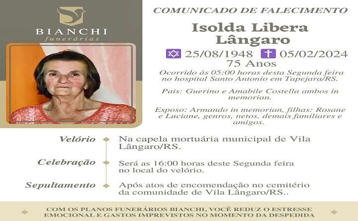 A Bianchi Funerárias, juntamente com a família Lângaro, comunica com pesar, o falecimento de Isolda Libera Lângaro, ocorrido às 05 horas do dia 05/02/2024 no HSA de Tapejara com 75 anos de idade. Seu corpo está sendo velado na Capela Mortuária de Vila Lângaro. Celebração às 16 horas do dia 05/02//2024 e após seu sepultamento no Cemitério Municipal de Via Lângaro.