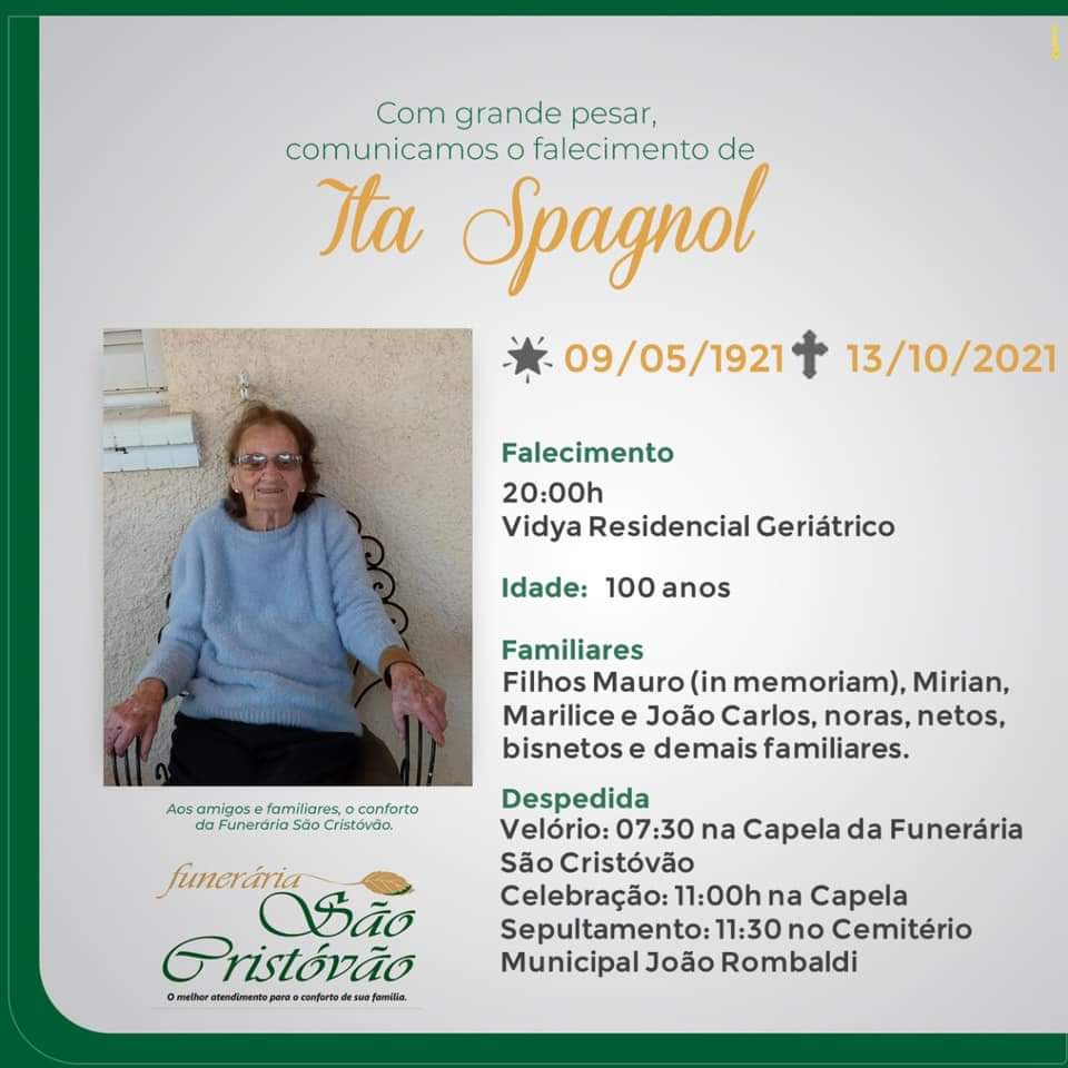 A Funerária São Crisóvão, juntamente com a família Spagnol, comunica com pesar, o falecimento da senhora Ita Spagnol, com 100 anos de idade, ocorrido as 20:30 horas de quarta-feira (13/10), no Vidya Residencial Geriátrico.