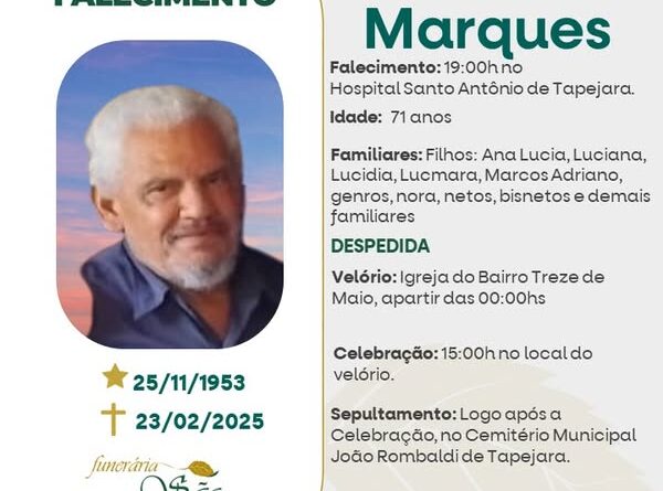 A Funerária São Cristóvão, juntamente com a família Marques, comunica com pesar, o falecimento de Itacir Marques, ocorrido às 19 horas do dia 23/02/2025 no HSA de Tapejara com 71 anos de idade. Seu corpo está sendo velado na Igreja do Bairro 13 de Maio. Celebração às 15 horas do dia 24/02/2025 e após seu sepultamento no Cemitério Municipal João Rombaldi.