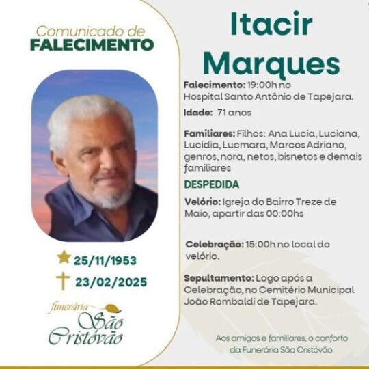A Funerária São Cristóvão, juntamente com a família Marques, comunica com pesar, o falecimento de Itacir Marques, ocorrido às 19 horas do dia 23/02/2025 no HSA de Tapejara com 71 anos de idade. Seu corpo está sendo velado na Igreja do Bairro 13 de Maio. Celebração às 15 horas do dia 24/02/2025 e após seu sepultamento no Cemitério Municipal João Rombaldi.