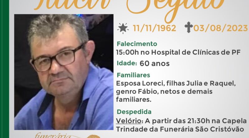 A Funerária São Cristóvão, juntamente com a família Segato, comunica com pesar, o falecimento de Itacir Segato, ocorrido às 15 horas do dia 03/08/2023 no Hospital de Clínicas de Passo Fundo com 60 anos de idade. Seu corpo será velado a partir das 21h 30min de hoje na Capela Trindade da Funerária São Cristóvão. Celebração às 14 horas do dia 04/08/2023 e após seu sepultamento no Cemitério Municipal João Rombaldi.