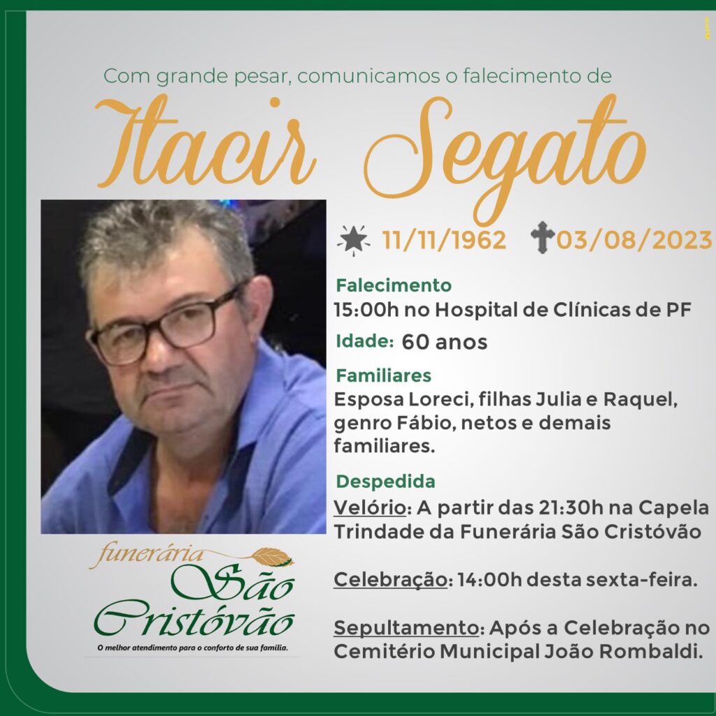 A Funerária São Cristóvão, juntamente com a família Segato, comunica com pesar, o falecimento de Itacir Segato, ocorrido às 15 horas do dia 03/08/2023 no Hospital de Clínicas de Passo Fundo com 60 anos de idade. Seu corpo será velado a partir das 21h 30min de hoje na Capela Trindade da Funerária São Cristóvão. Celebração às 14 horas do dia 04/08/2023 e após seu sepultamento no Cemitério Municipal João Rombaldi.