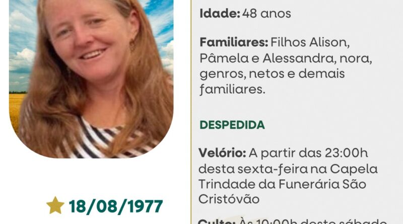 A Funerária São Cristóvão, juntamente com a família Cordeiro, comunica com pesar, o falecimento de Ivete Alves Cordeiro , ocorrido às 13 horas do dia 19/12/2025 em sua residência em Tapejara com 48 anos de idade. Seu corpo será velado a partir das 23 hora do dia 19/12/2025 na Capela Trindade da Funerária São Cristóvão. Culto às 10 horas do dia 20/12/2025 e após seu sepultamento no Cemitério Municipal João Rombaldi.
