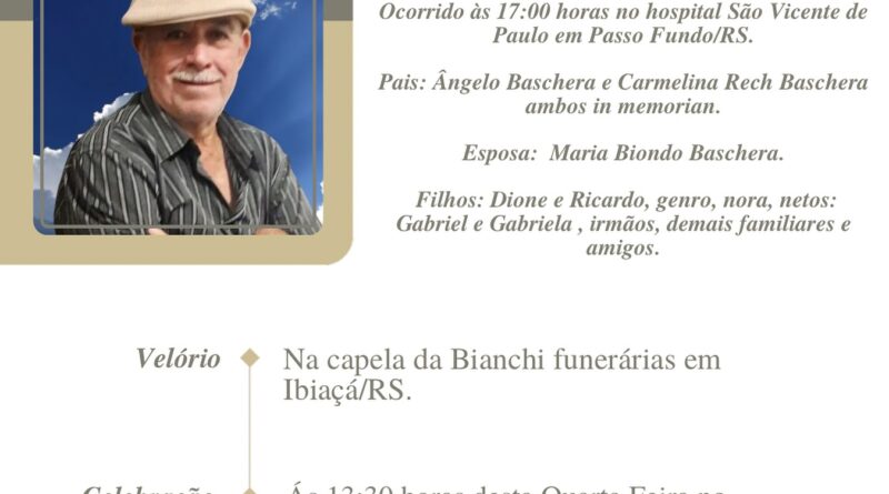A Bianchi Funerárias, juntamente com a família Baschera, comunica com pesar, o falecimento de Jacinto Baschera, ocorrido às 17 horas do dia 09/09/2025 no Hospital São Vicente de Paulo de Passo Fundo com 79 anos de idade. Seu corpo está sendo velado na Capela da Bianchi Funerárias de Ibiaçá. Celebração às 13h30 do dia 10/09/2025 no Santuário Nossa Senhora Consoladora e após seu sepultamento no Cemitério Municipal de Ibiaçá.