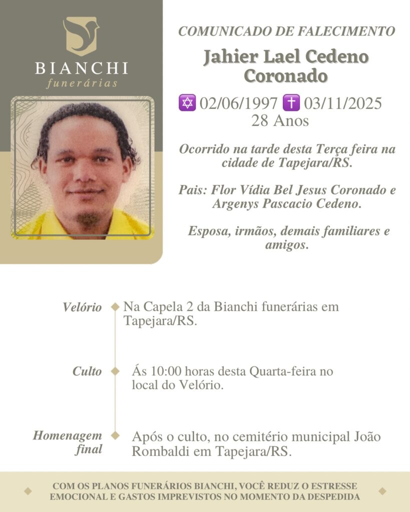 A Bianchi Funerárias, juntamente com a família Coronado,, comunica com pesar, o falecimento de Jahier Lael Cedeno Coronado, ocorrido dia 04/11/2025 em Tapejara com 28 anos de idade. Seu corpo está sendo guardado na Capela 2 da Bianchi Funerárias. Culto às 14 horas do dia 05/11/2025 e após seu corpo será sepultado no Cemitério Municipal João Rombaldi.