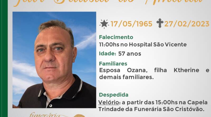 A Funerária São Cristóvão, juntamente com a família do Amaral, comunica com pesar, o falecimento de Jair Batista do Amaral, ocorrido às 11:00 horas do dia 27/02/2023 no Hospital São Vicente de Paulo de Passo Fundo com 57 anos de idade. Seu corpo será velado a partir das 15:00 horas na Capela Trindade da Funerária São Cristóvão. Celebração às 09:00 horas do dia 28/02/2023 e após seu sepultamento no Cemitério Municipal João Rombaldi.