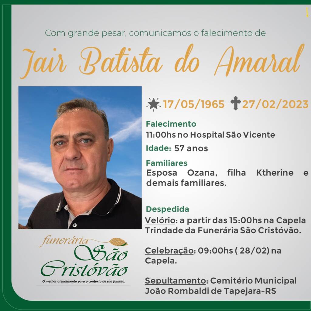 A Funerária São Cristóvão, juntamente com a família do Amaral, comunica com pesar, o falecimento de Jair Batista do Amaral, ocorrido às 11:00 horas do dia 27/02/2023 no Hospital São Vicente de Paulo de Passo Fundo com 57 anos de idade. Seu corpo será velado a partir das 15:00 horas na Capela Trindade da Funerária São Cristóvão. Celebração às 09:00 horas do dia 28/02/2023 e após seu sepultamento no Cemitério Municipal João Rombaldi.