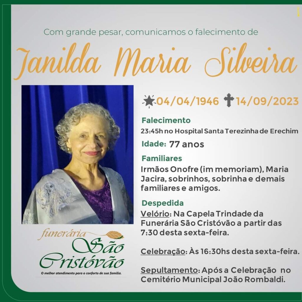 A Funerária São Cristóvão, juntamente com a família Silveira, comunica com pesar, o falecimento de Janilda Maria Silveira, ocorrido às 23h 45 do dia 14/09/2023 no Hospital Santa Terezinha de Erechim com 77 anos de idade. Seu corpo está sendo velado na Capela Trindade da Funerária São Cristóvão. Celebração às 16h 30 do dia 15/09/2023 e após seu sepultamento no Cemitério Municipal João Rombaldi.