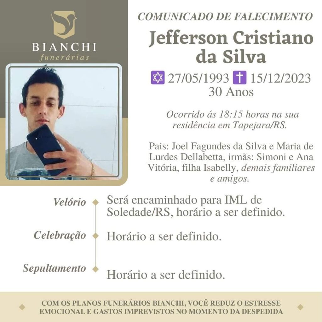 A Bianchi Funerárias, juntamente com a família Silva, comunica com pesar, o falecimento de Jefferson Cristiano da Silva, ocorrido ãs 18h15 do dia 15/12/2023 em sua residência em Tapejara com 30 anos de idade. Seu corpo foi encaminhado para o IML de Soledade. Velório, celebração e sepultamento com horário a ser definido.