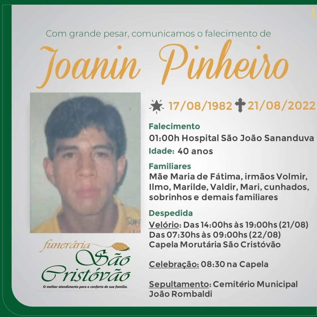 A Funerária São Cristóvão, juntamente com a família Pinheiro, comunica com pesar, o falecimento de Joanin Pinheiro, ocorrido a 01:00 horas do dia 21/08 no HSA com 40 anos de idade. Seu corpo está sendo velado na Capela da Funerária São Cristóvão. Celebração às 08:30 horas do dia 22/08 e após seu sepultamento. No Cemitério Municipal João Rombaldi.