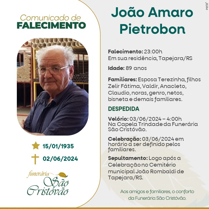 A Funerária São Cristóvão, juntamente com a família Pietrobon, comunica com pesar, o falecimento de João Amaro Pietrobon, ocorrido às 23 horas do dia 02/06/2024 em sua residência em Tapejara com 89 anos de idade. Seu corpo está sendo velado na Capela Trindade de Tapejara. Celebração na tarde do dia 03/06/2024 com horário a ser definido e após seu sepultamento no Cemitério Municipal João Rombaldi.