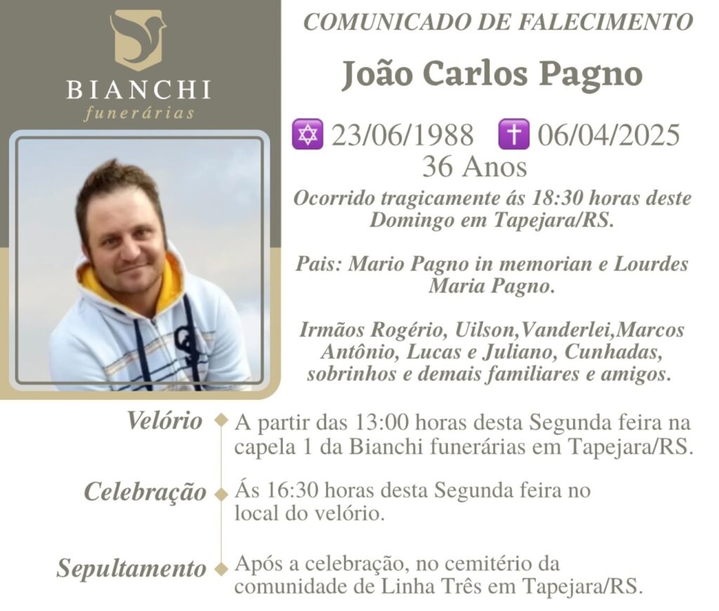 A Bianchi Funerárias, juntamente com a família Pagno, comunica com pesar, o falecimento de João Carlos Pagno, ocorrido às 18h30 do dia 06/04/2025 em Tapejara – RS. Seu corpo será velado a partir das 13 horas do dia 07/04/2025 na Capela I da Bianchi Funerárias. Celebração às 16h30 do dia 07/04/2025 e após seu sepultamento no Cemitério da Comunidade de Linha 3 – Tapejara/RS.