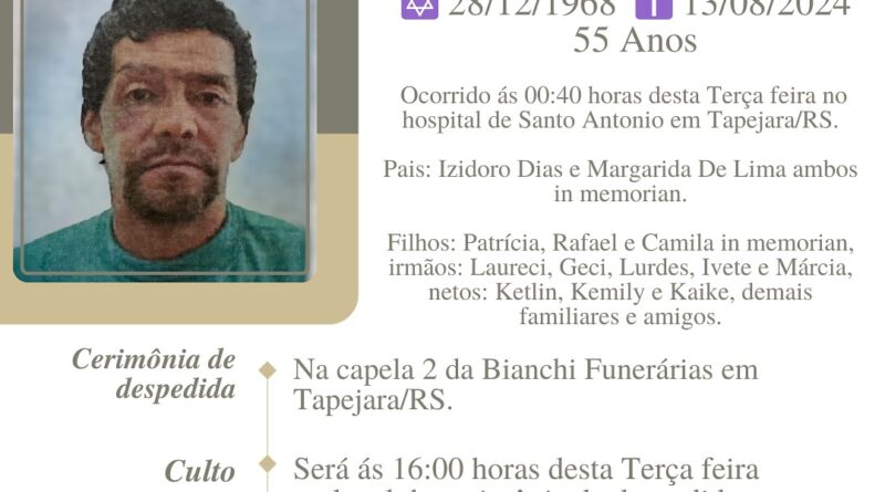 A Bianchi Funerárias, juntamente com a família Dias, comunica com pesar, o falecimento de João Elias Dias – “Preto”, ocorrido às 00h40 do dia 13/08/2024 no HSA de Tapejara com 55 anos de idade. Seu corpo está sendo velado na Capela 2 da Bianchi Funerárias. Celebração às 16 horas do dia 13/08/2024 e após seu sepultamento no Cemitério Municipal João Rombaldi de Tapejara.