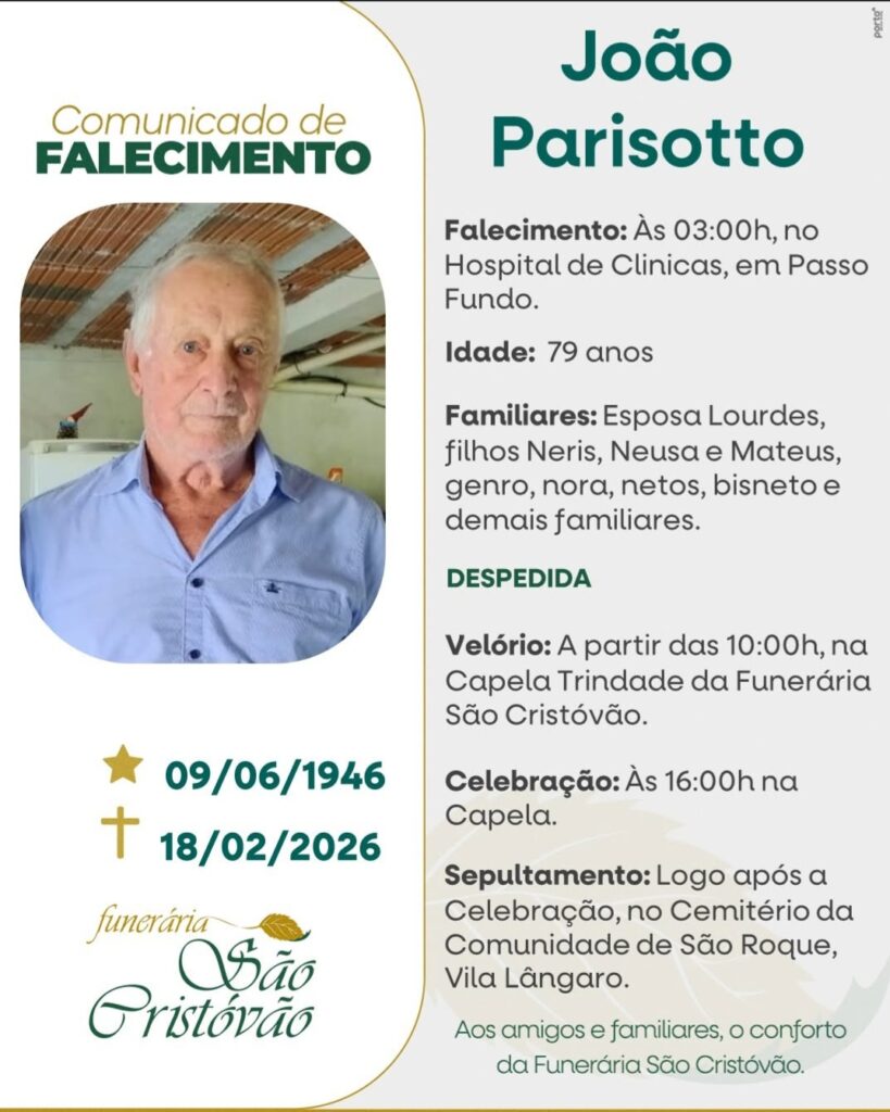 A Funerária São Cristóvão, juntamente com a família Parisotto, comunica com pesar, o falecimento de João Parisotto, ocorrido às 03h00 do dia 18/02/2026 no Hospital de Clinicas de Passo Fundo, com 79 anos de idade. Seu corpo está sendo velado na Capela Trindade da Funerária São Cristóvão. Celebração às 16 horas do dia 18/02/2026 e após seu sepultamento no Cemitério da Comunidade de São Roque Va Lângaro.