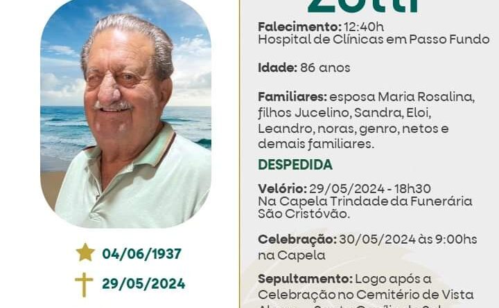A Funerária São Cristóvão, juntamente com a Família Zotti, comunica com pesar, o falecimento de João Zotti, ocorrido às 12h40 do dia 29/05/204, no Hospital de Clínicas de Passo Fundo, com 86 anos de idade. Seu corpo está sendo velado na Capela Trindade da Funerária São Cristóvão. Celebração às 09 horas do dia 30/05/2024 e após seu sepultamento no Cemiério de Vista Alegre – Santa Cecília do Sul.